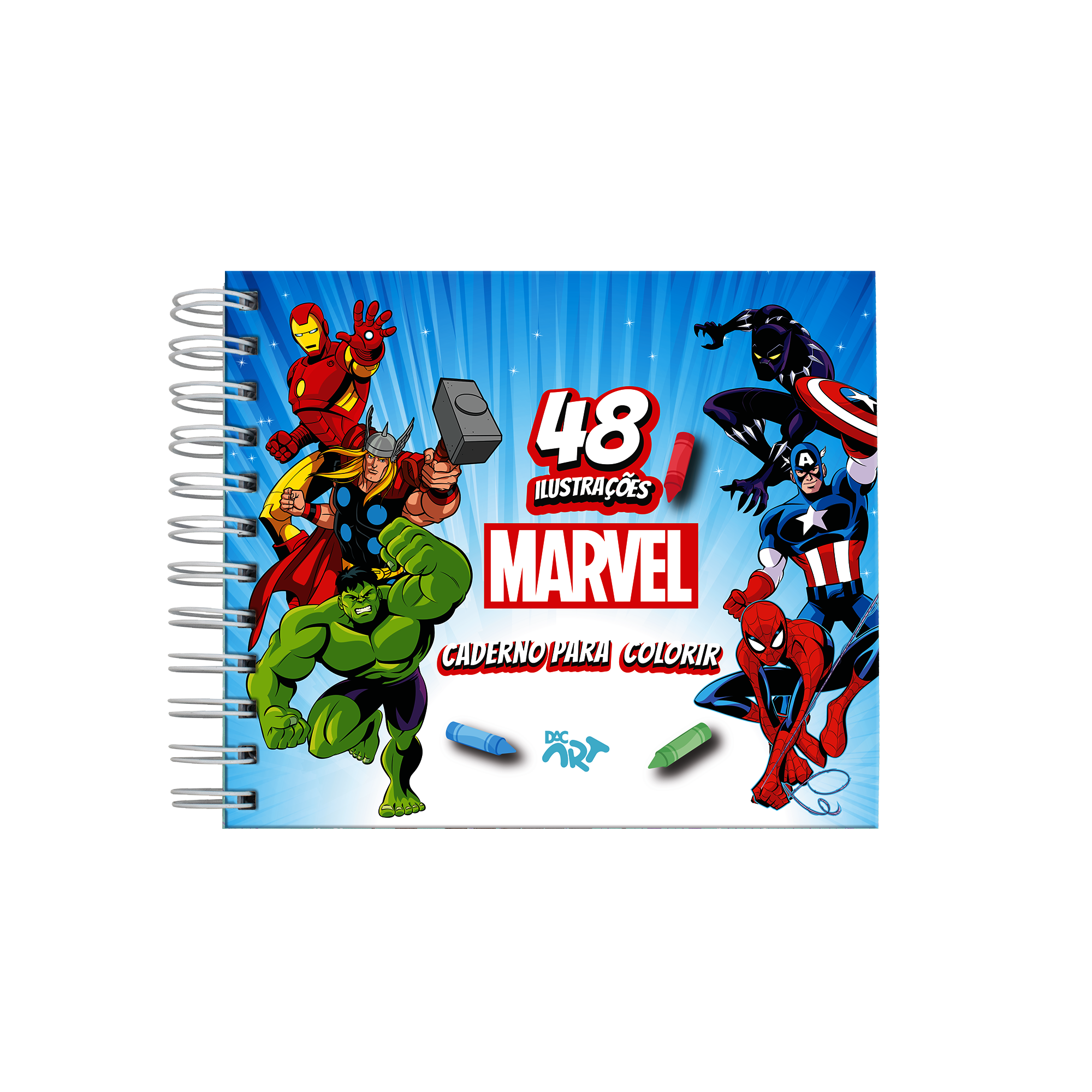 Encante-se com o Caderno do Avengers! 48 desenhos, cartela com adesivos, acetato protetor e espiral resistente. Ideal para crianças e fãs da Marvel.